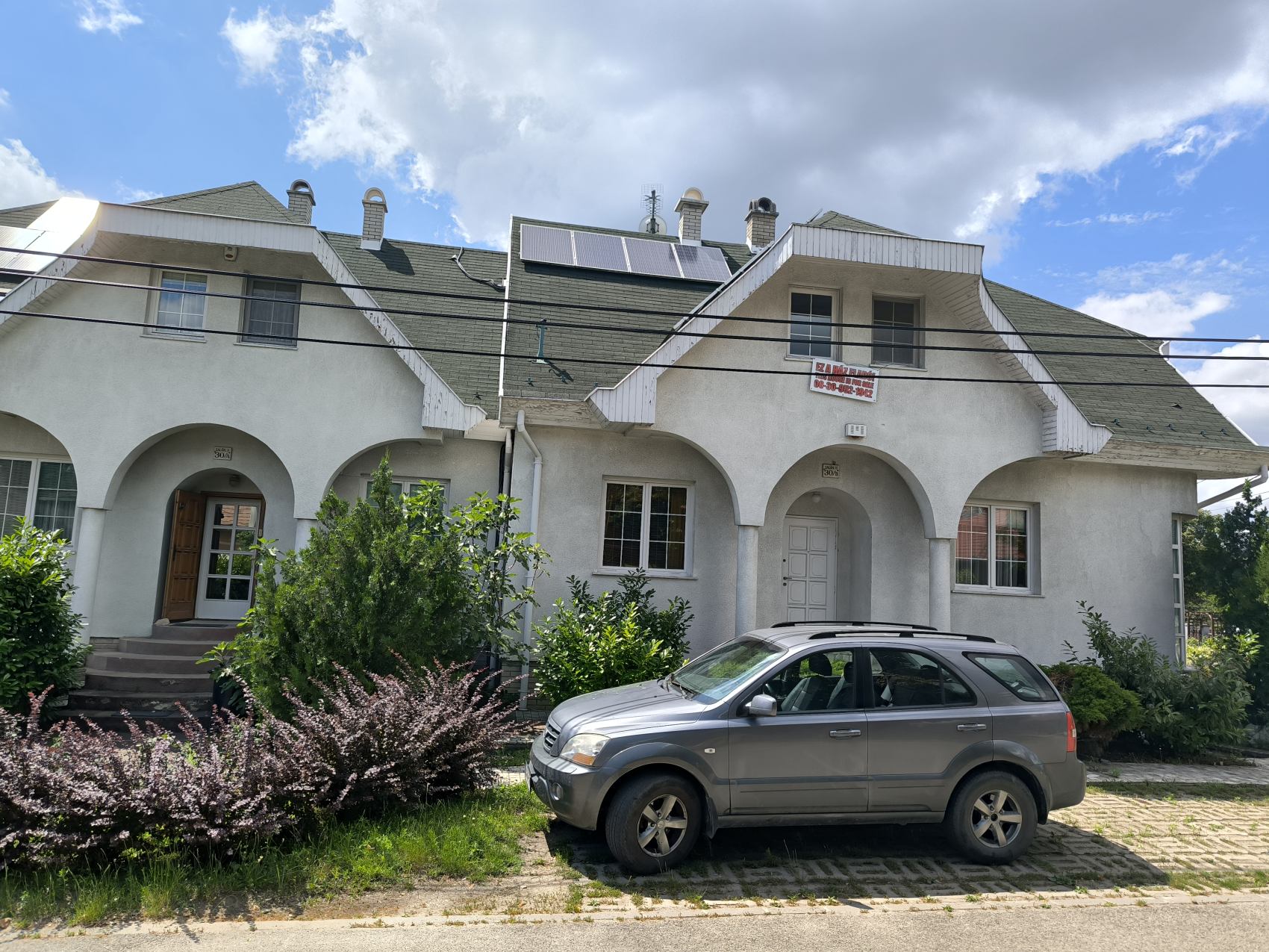 Az egyenként 120 nm alapterületű két szintes lakóház a 90-es évek derekán épült téglából, az akkor jellemző stílusban, minőségi anyagokból, egyedi kialakítással.