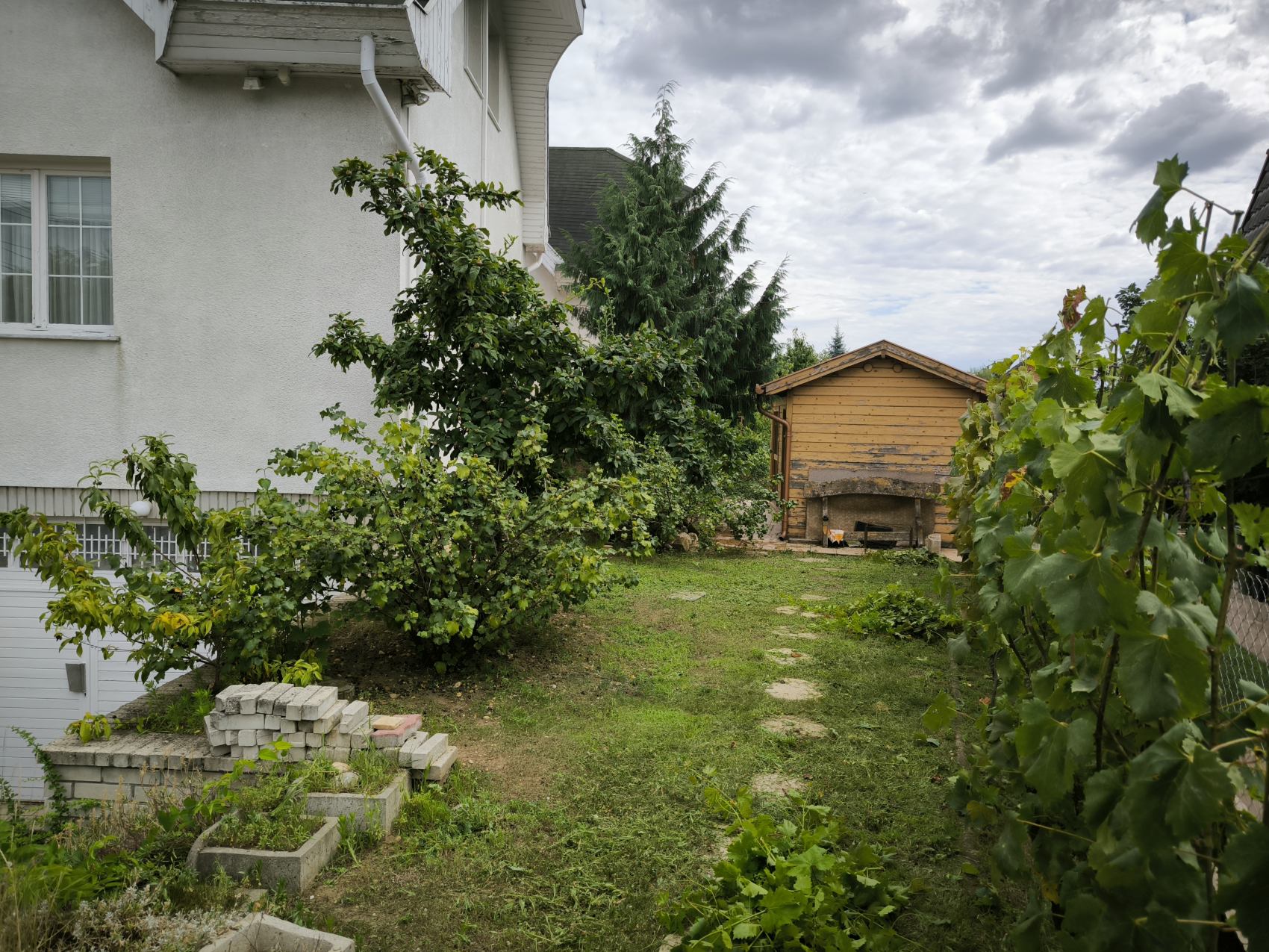 A szépen gondozott, füvesített udvaron számos termő gyümölcsfa nő.